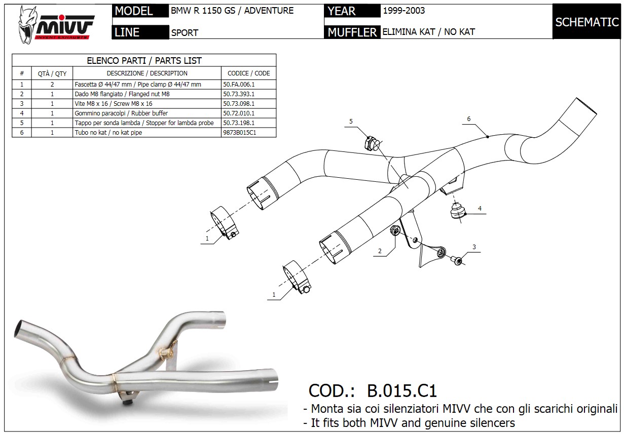 | Extra informatie: | - Deze Decat Pipe is zowel passend in combinatie met een pasklare Mivv einddemper maar ook met de originele einddemper of iedere andere pasklare einddemper voor de BMW R1150GS 1999 > 2003