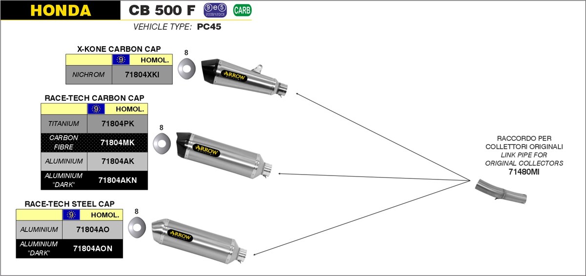 - Arrow Race-Tech Aluminium Einddemper met E-keur (71804AK) incl. Linkpipe (71480MI) Alle afbeeldingen dienen ter illustratie. De afbeeldingen van de betreffende Arrow uitlaat in de schematische tekening zijn altijd leidend m.b.t. het artikel dat geleverd wordt.