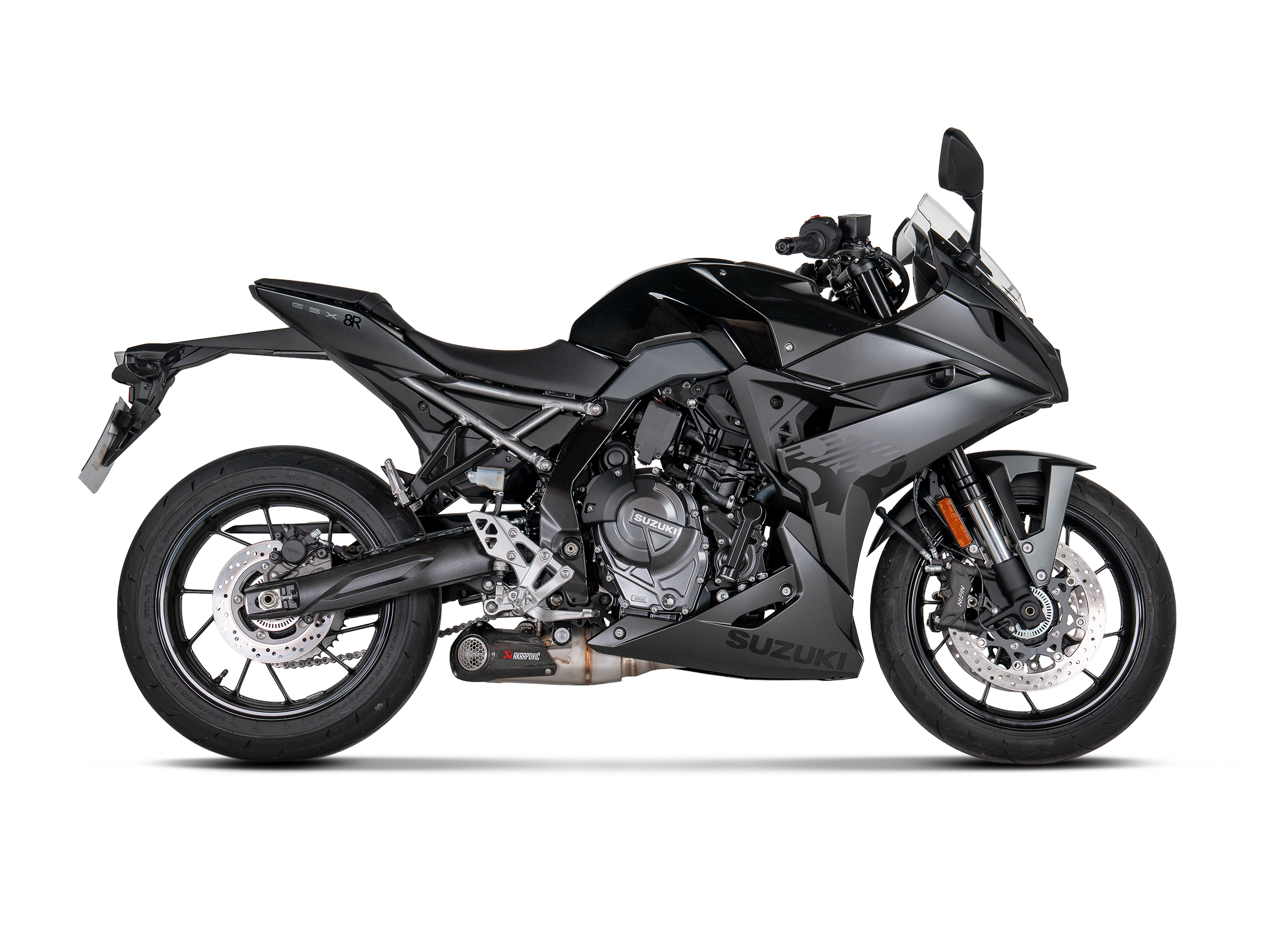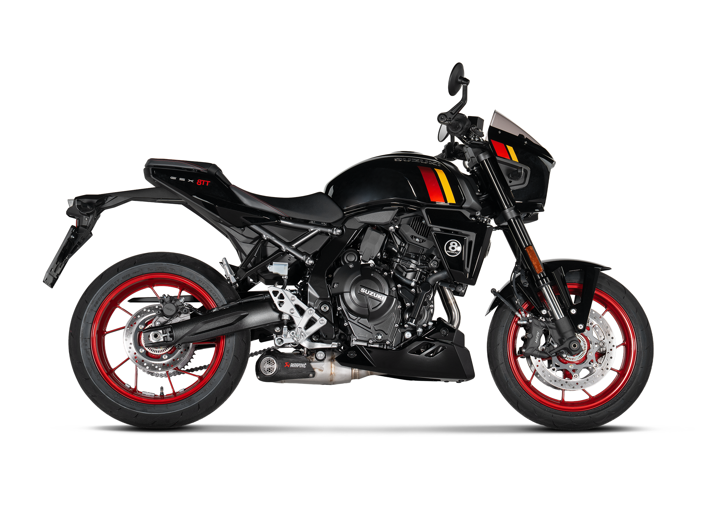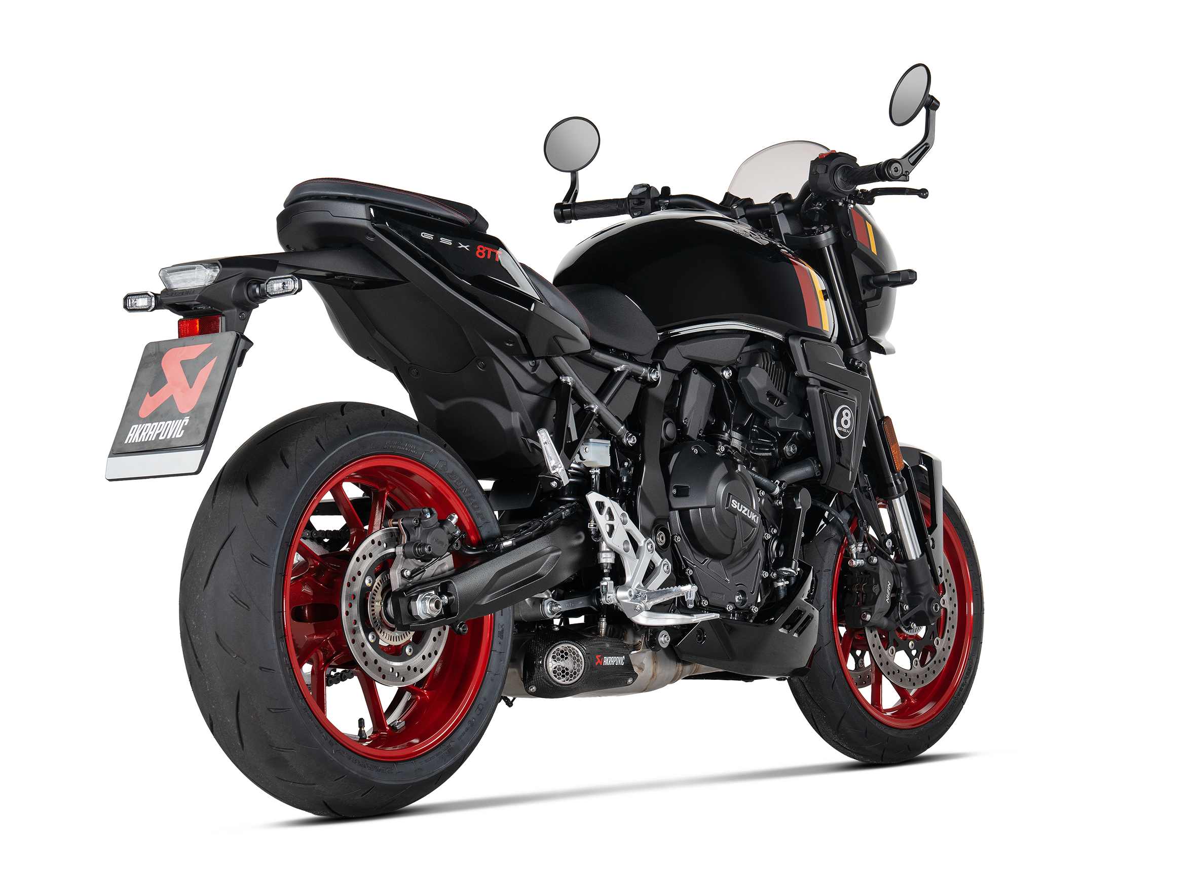 If features plug-and-play installation with no remapping required. Focus was placed on optimal throttle response and performance during development, which has resulted in a power increase of 1.8 kW (2.5 hp) at 9,500 rpm and a torque boost of 1.4 Nm at 5,500 rpm when compared to a Suzuki GSX-8S with a standard stock exhaust system and tested on the Akrapovič in-house dyno. Weight is reduced by 29.1% (2.2 kg) compared to the standard stock exhaust system. Delivering a deep and sporty sound, this full system is EC/ECE type approved and Euro 5+ compliant. It has been designed so that it can also be mounted in combination with the original Suzuki soft sided case set.