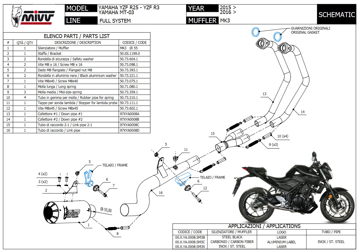 Mivv MK3 Carbon Compleet Uitlaatsysteem zonder E-keur Yamaha YZF-R3 2015 > 2024